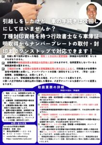 ◆確認・注意事項 本来、書類作成をメイン業務としている行政書士にとって、出張封印は、例外的に工具を用いた物理的作業を含む業務となります。 当事務所においても令和7年10月以降、出張封印が可能となるところであり、出張封印を […]